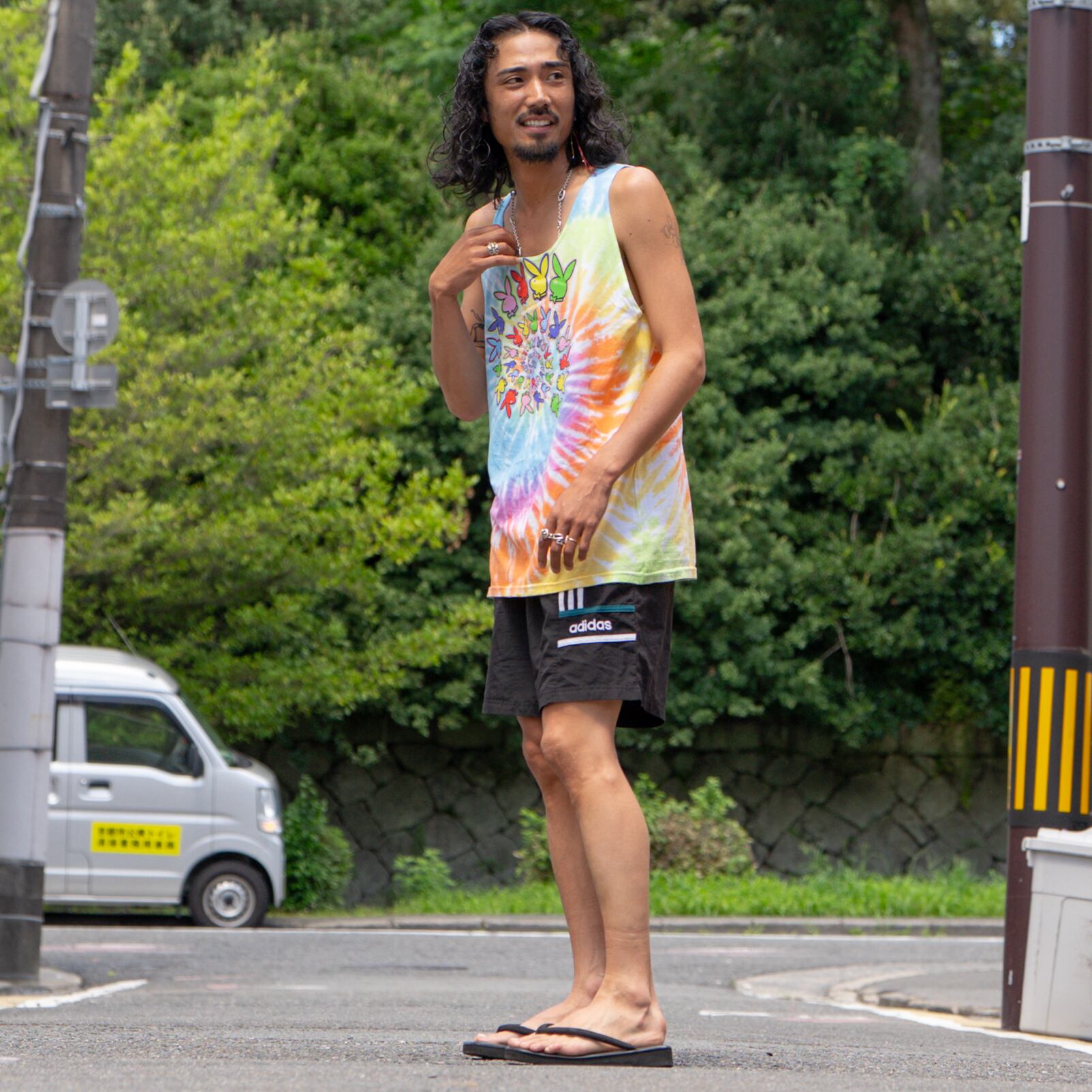 鮮やかなレインボータイダイに、カラフルなバニーたちがポップに踊る、夏全開な1枚。