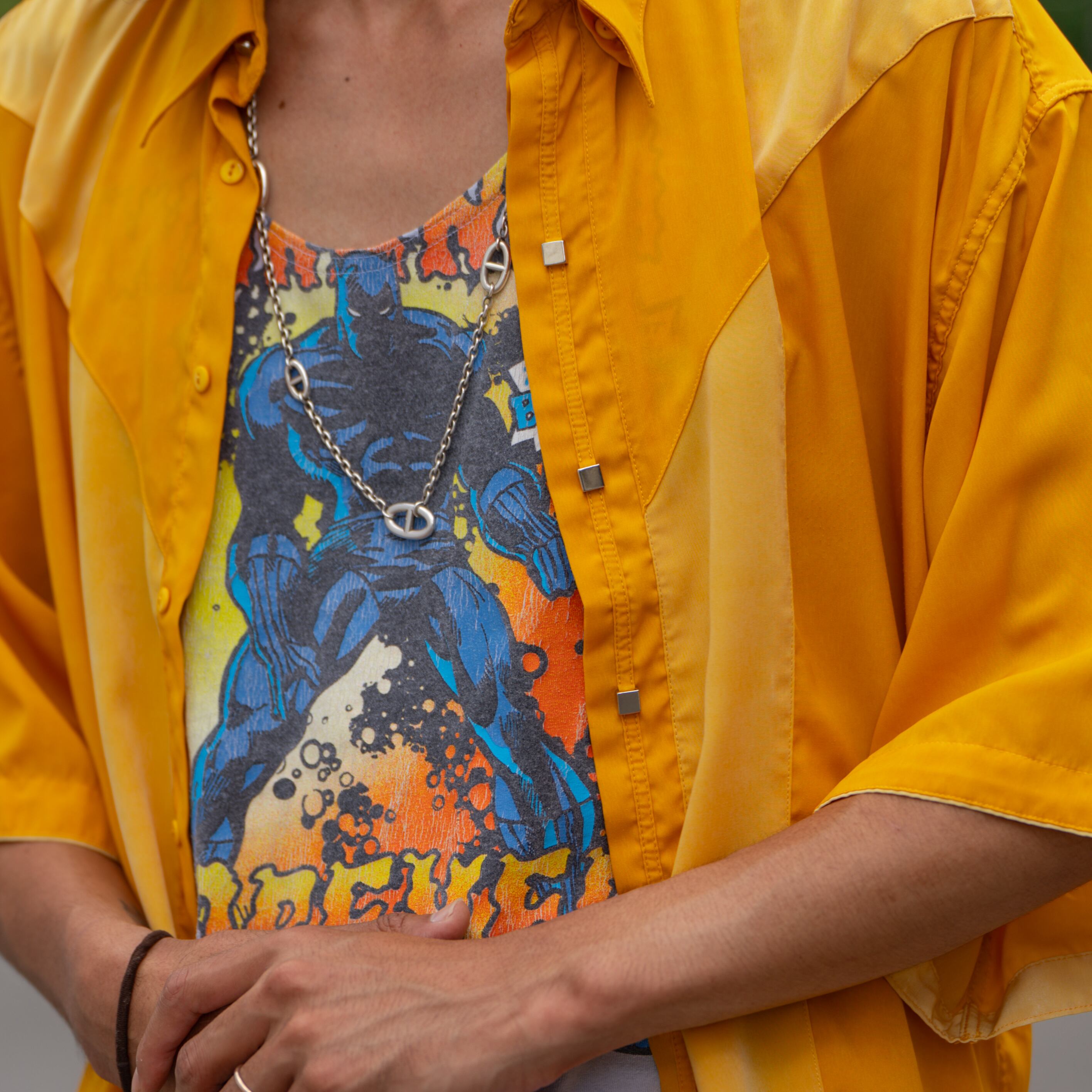 アメリカのブランド「LECHÉ(レチェ)」によるサテンオープンカラーシャツ。