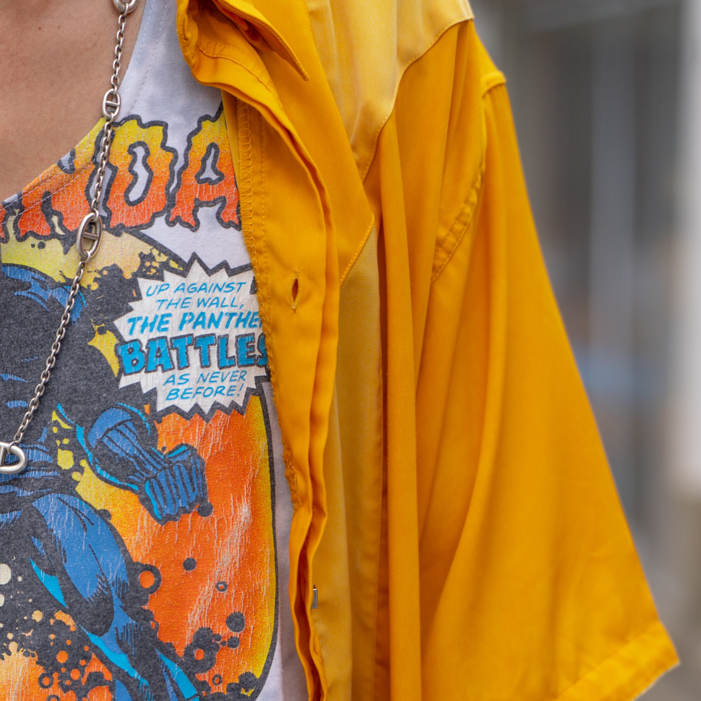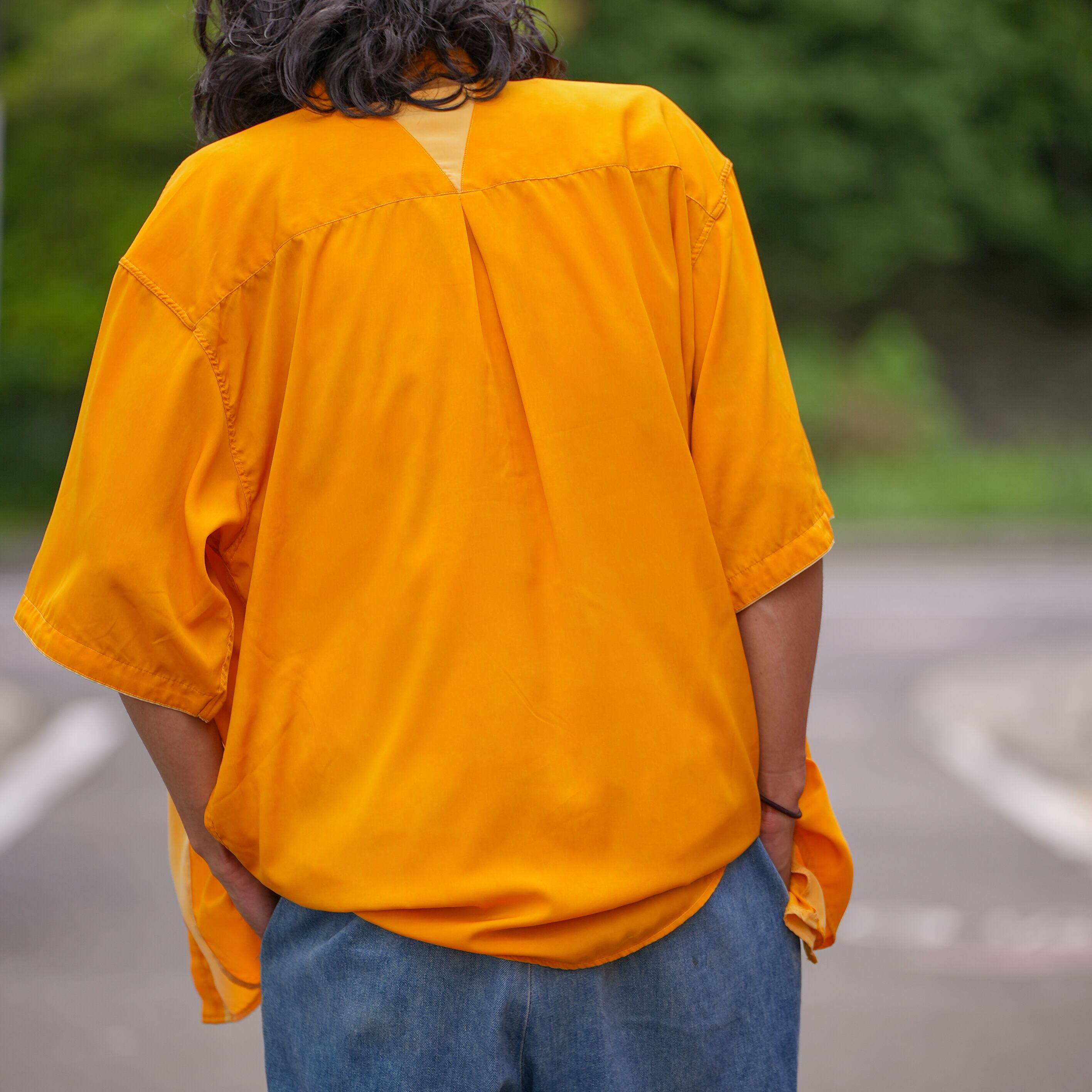 ビビッドなオレンジ×イエローのツートーン配色と、艶感のある軽やかなサテン生地が魅力の1枚。