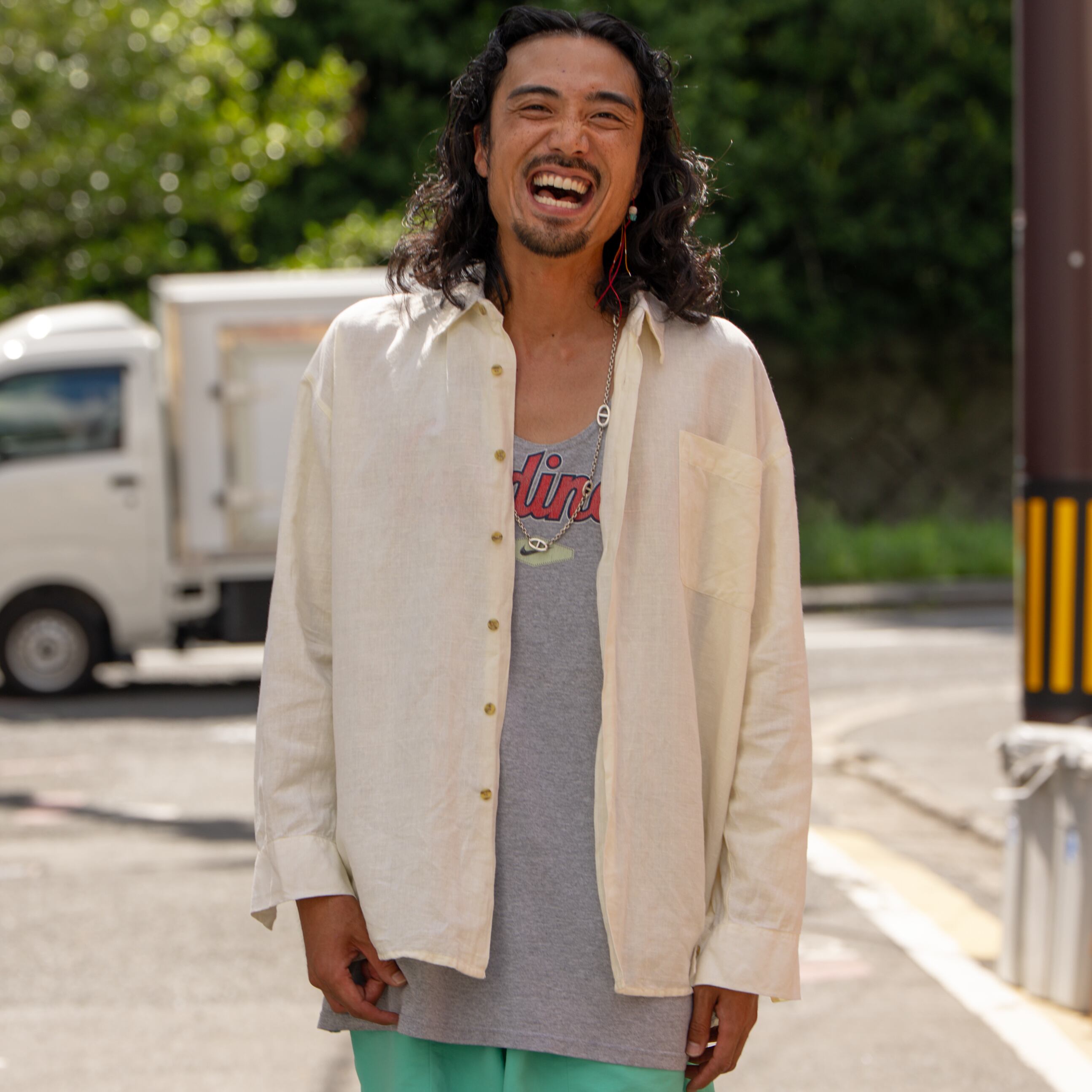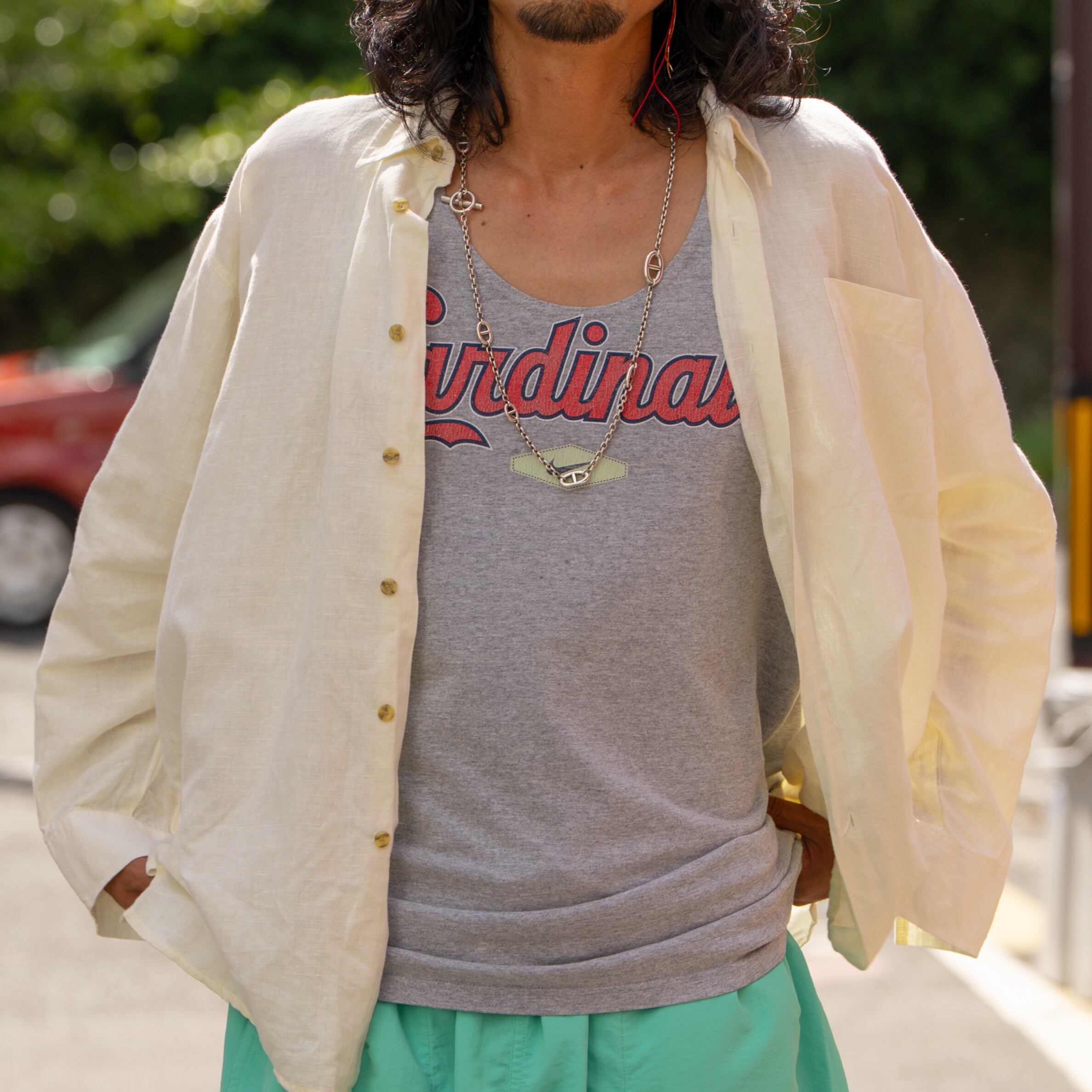 リメイクタンクトップやカラーパンツとの相性も抜群で、リゾート感のあるストリートミックスな着こなしに。