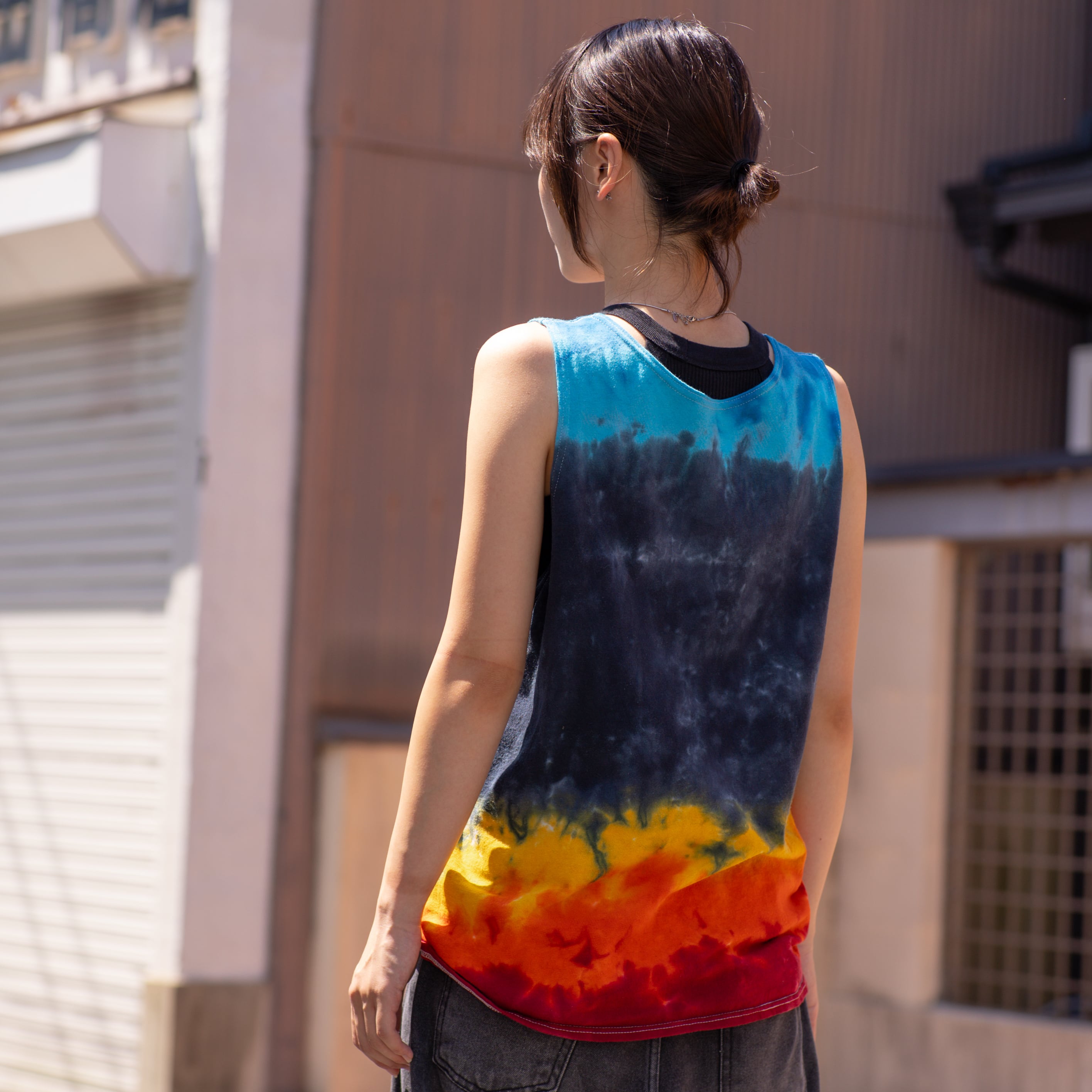 フロントのレッド×ブルー×イエローのグラデーションカラーが目を惹き、ロックテイストとサイケな雰囲気が絶妙に融合。
