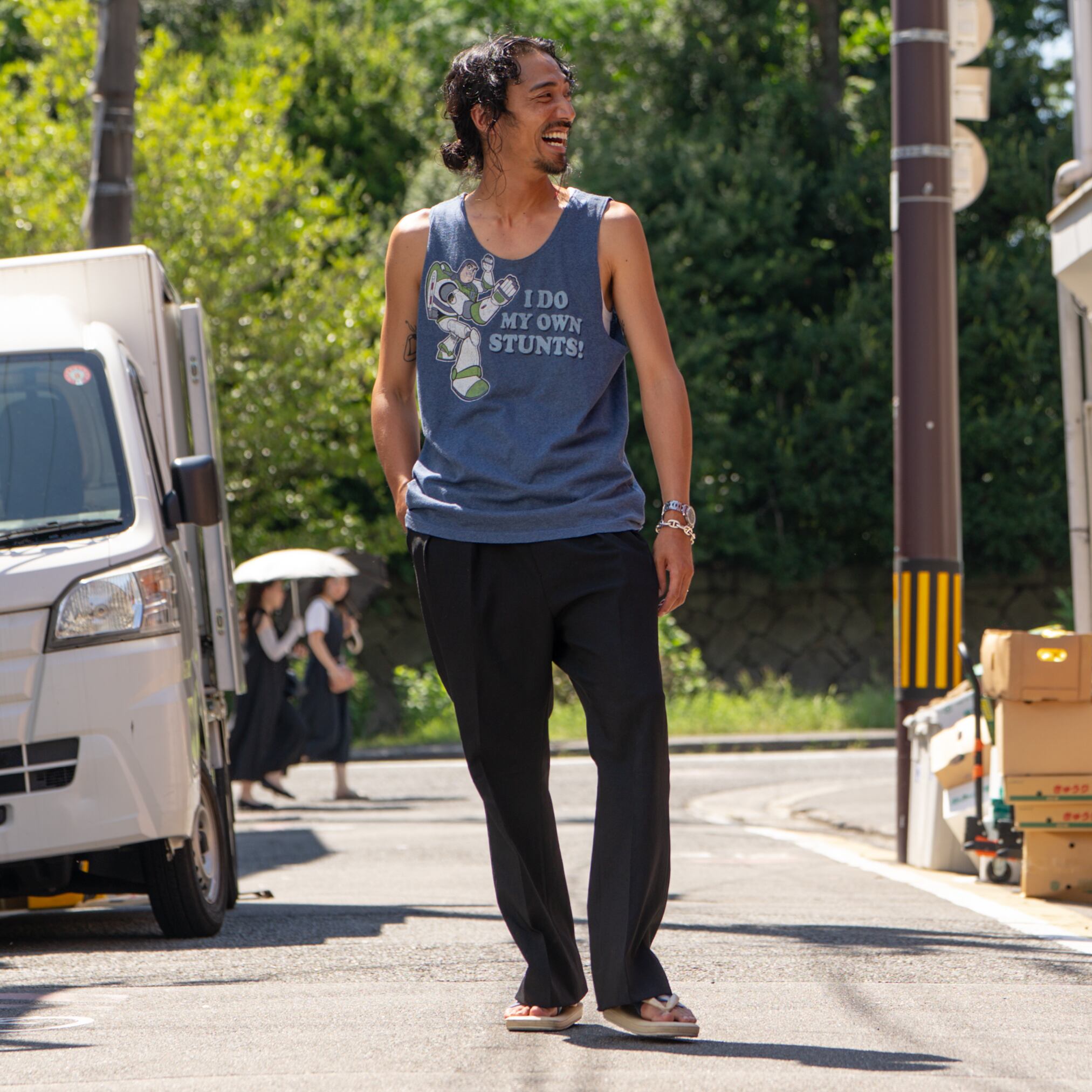 ディズニー/ピクサーの名作『トイ・ストーリー』より、人気キャラクター“バズ・ライトイヤー”をプリントしたTシャツをタンクトップにリメイク。