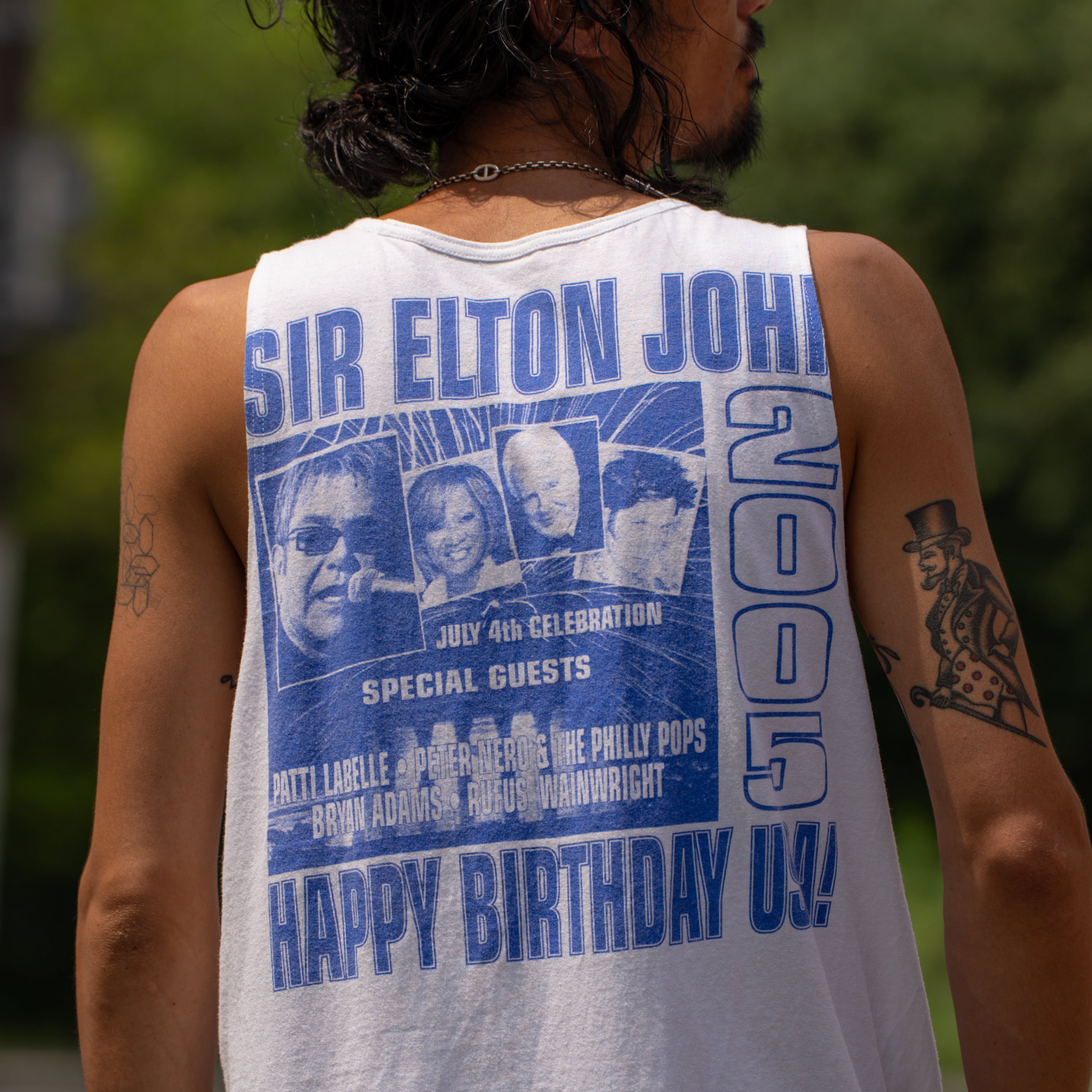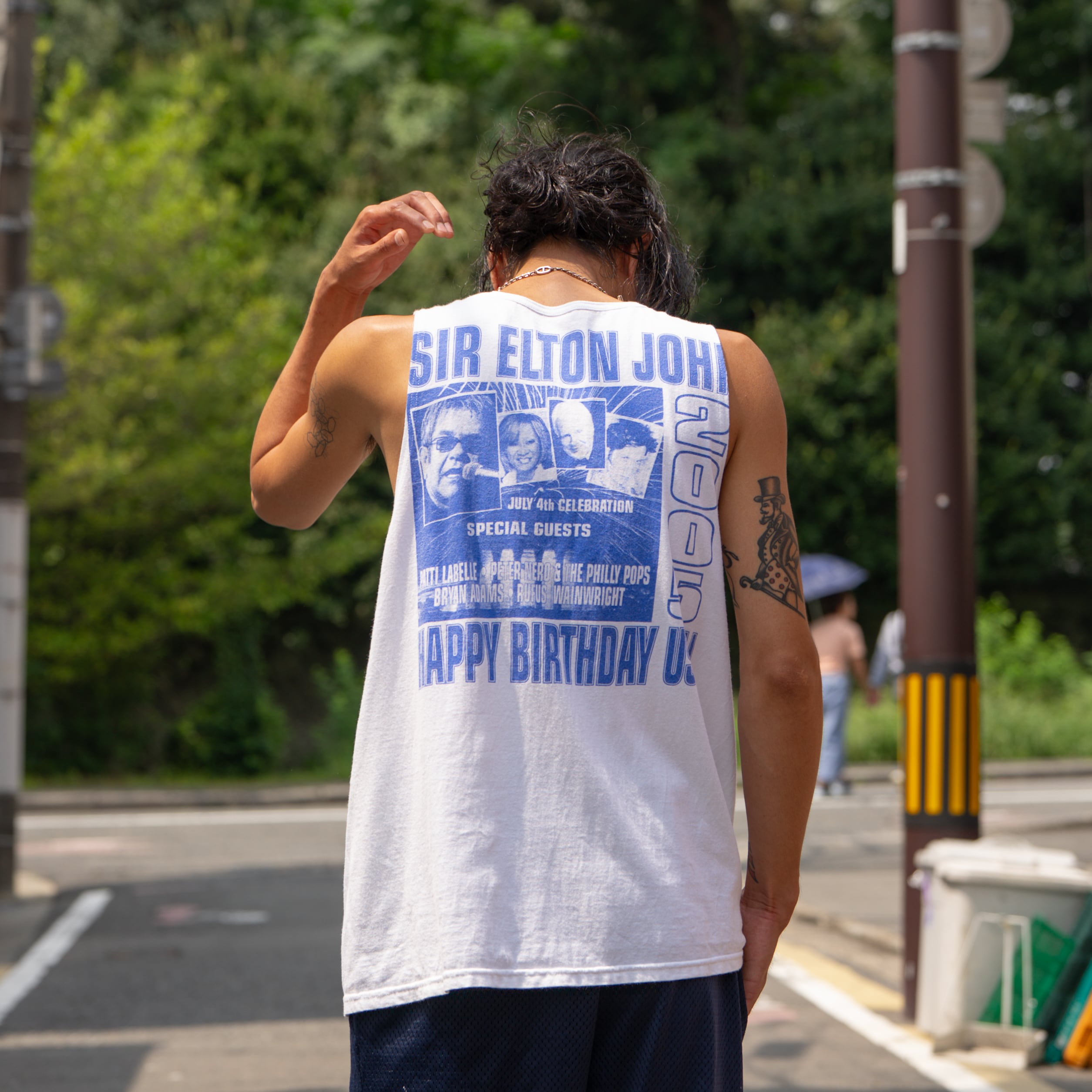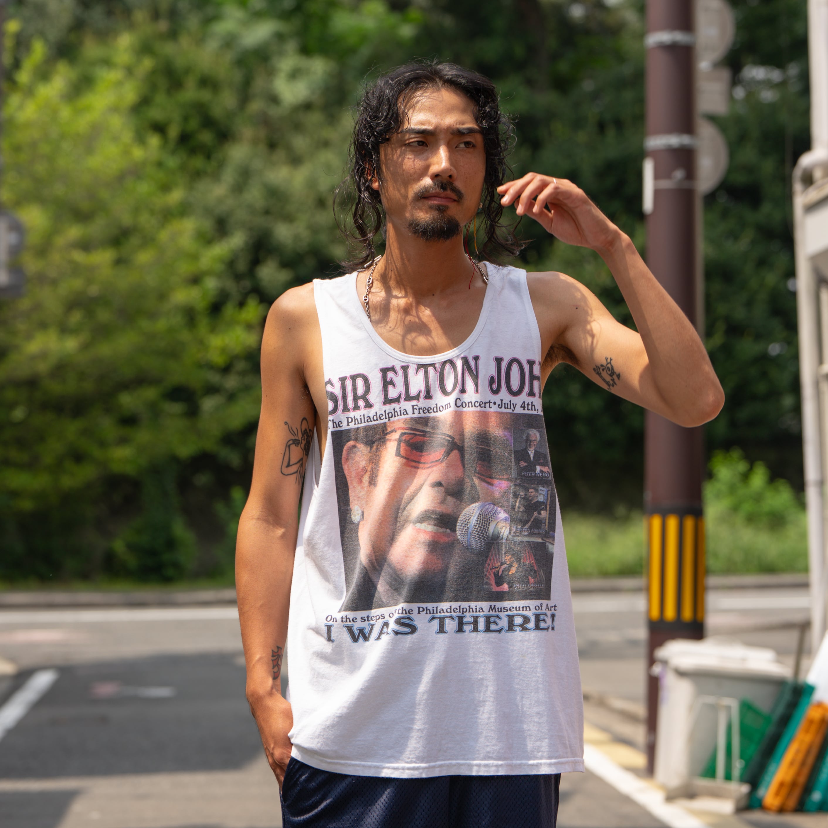 90s〜00s初頭頃のエルトン・ジョンのフォトTシャツを大胆にカットオフし、タンクトップへリメイクした一着。