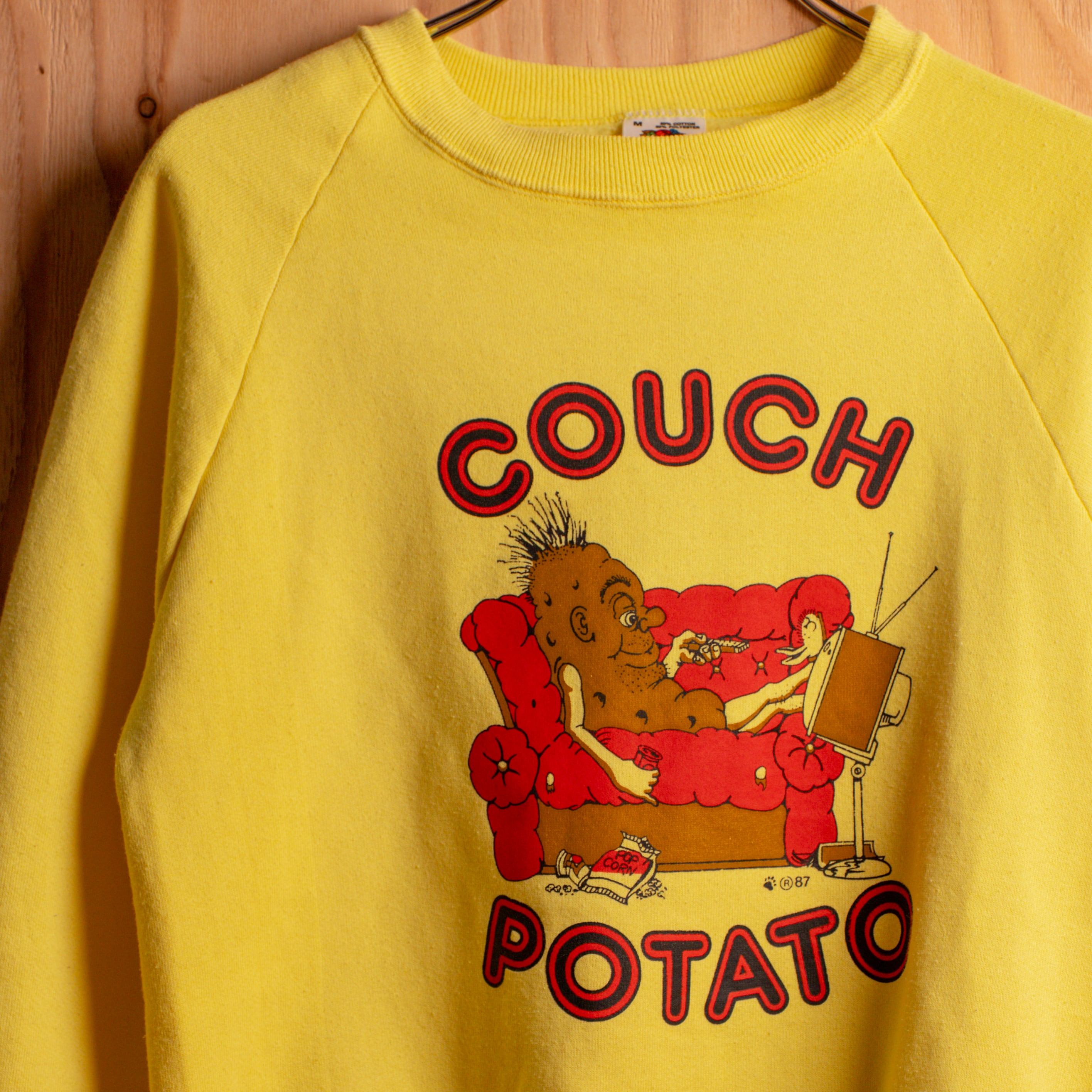 柔らかなイエローボディに「COUCH POTATO」のレトロプリント。